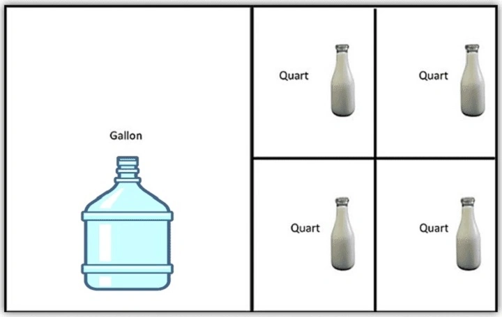 - Draw a picture: one large square with four small squares inside. Each small square is a quart, the whole big one is a gallon.